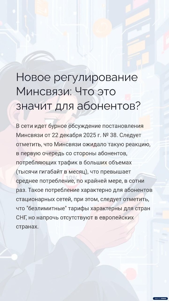». В Минсвязи развеяли мифы о новом регулировании мобильного интернета В сети бурно обсуждают постановление Минсвязи об ограничении объема услуг передачи данных на безлимитных тарифах. ✔️ В Минсвязи отметили, что такая реакция ожидаема, особенно от абонентов стационарных сетей, которые потребляют тысячи гигабайт в месяц - это в сотни раз превышает средние показатели. Такие безлимитные тарифы типичны для стран СНГ, но в европейских странах их просто нет. 💬 «Важно развеять мифы: мобильный интернет никто не отключает, безлимиты никуда не исчезают, просто вводится новое регулирование для операторов. Большинства пользователей оно даже не коснется», - отметили в ведомстве.