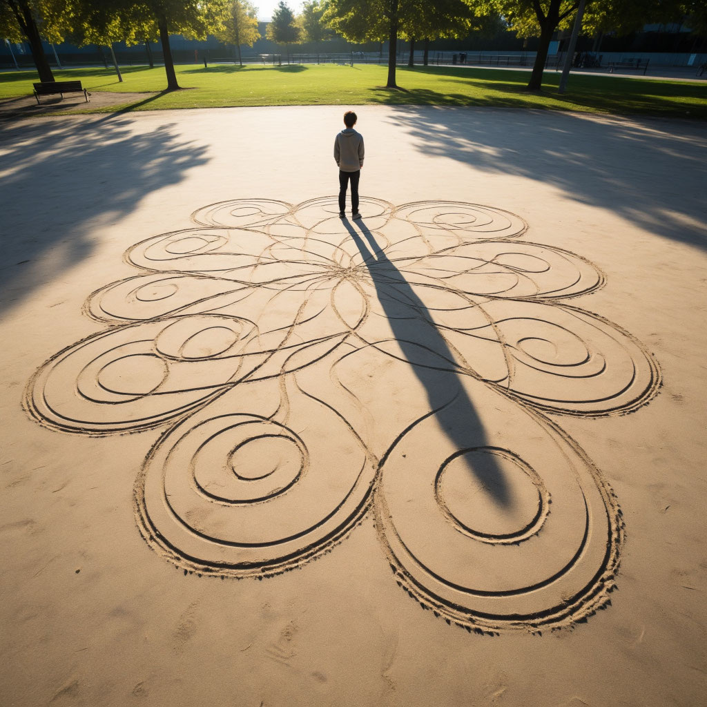 Действие: Создание двухмерной композиции на песке рекреационной площадки с использованием нестандартного инструмента (собственные пальцы).
