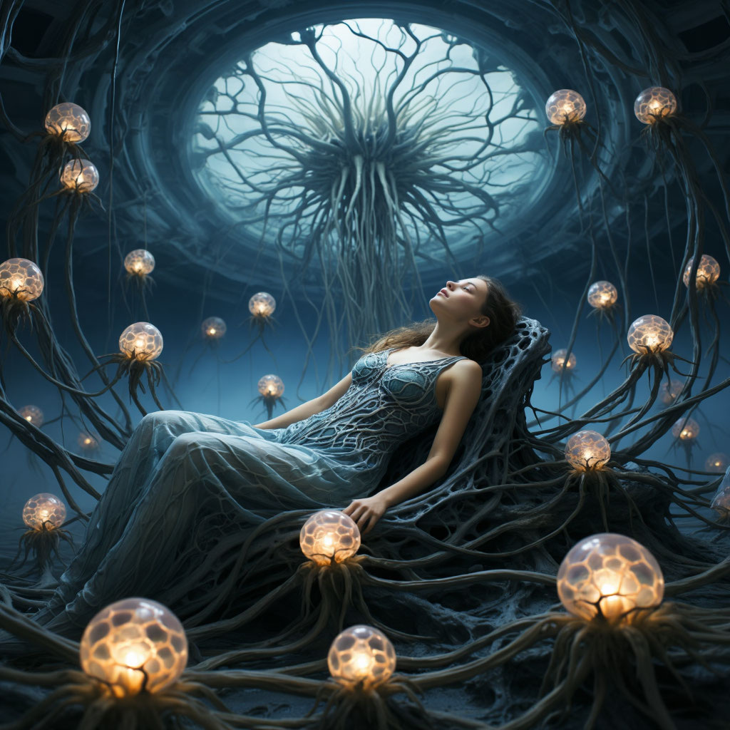 Лиана лежала в центре биологического пульсара. Ее тело, изящное и хрупкое на вид, было опутано тысячами живородящих капилляров, которые соединяли ее нервную систему с гигантским коллективным разумом Улья. Она не спала и не бодрствовала. Она пребывала в состоянии Слушания.