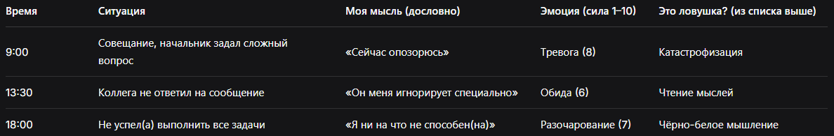 - 5 главных мыслительных ловушек (долженствование, катастрофизация и др.).