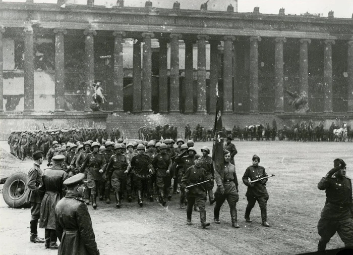 Здравствуйте Уважаемые читатели! Очень интересная фотография! Это, наверное, один из самых малоизвестных парадов Красной армии. 4 мая 1945 года торжественно по центру вражеской столице прошли подразделения, участвовавшие в штурме Берлина который был взят к 2 мая. На этом параде нет специально подготовленной и начищенной до блеска техники, не выдана новая форма бойцам и их командирам, а лица участников парада, усталые после наступление с плацдармов на Одере и штурма самого Берлина.Так же я рассказывал, как Польша пыталась отбить у СССР Литву в 1944 году. А на этом все. Еще больше публикаций на канале "Наша история это Гордость" в ТГ. До свидания! Пост автора nashaistoriagord. Читать комментарии на Пикабу.