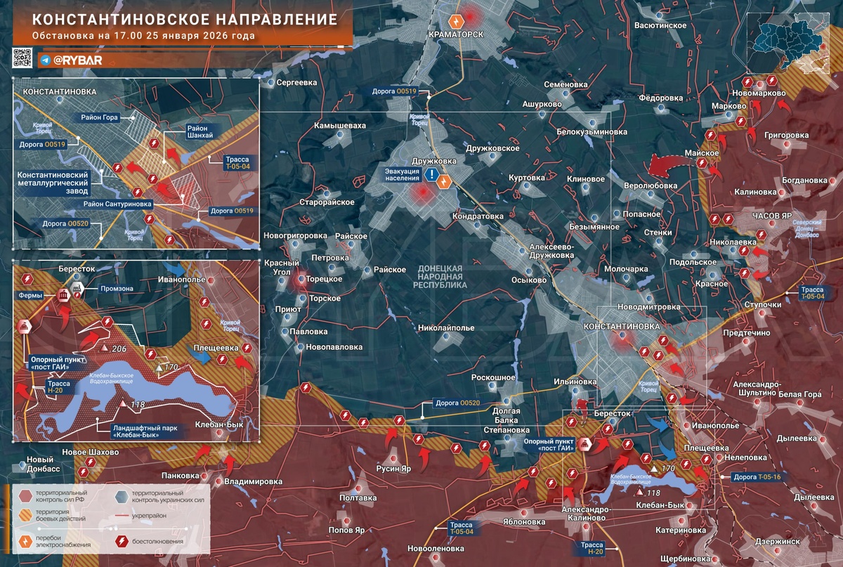 🔸На Константиновском направлении продолжается наступление подразделений группировки войск «Юг» сразу на нескольких участках — как в черте города, так и южнее него. 🔸В Константиновке штурмовые подразделения углубляются в застройку центральной части города. Это стало возможным после зачистки дачного массива к юго-востоку от трассы Н-32 (Т-0504). Обстановка остаётся сложной из-за высокой плотности ВСУ, которые смогли нарастить присутствие под прикрытием неблагоприятных погодных условий даже с учетом высоких потерь от действий российских дроноводов. 🔸Расширяется зона контроля и на южном фланге, в районе Клебан-Быкского водохранилища. Российским подразделениям удалось занять северный берег водоёма и большую часть ландшафтного парка. Территории севернее остаются под контролем противника, частично представляя собой зону очагового присутствия сверхмалых групп. Отсюда противник совершает вылазки к Иванополью и Плещеевке. 🔸На подступах к Берестку российские подразделения продвинулись со стор