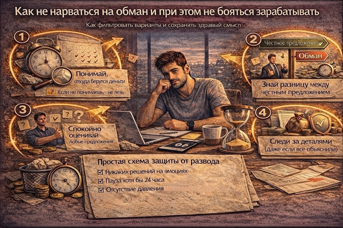 Когда ты долго читаешь про заработок в интернете, в голове постепенно формируется крайность. Либо: "Везде обман" либо "вот оно, сейчас точно получится". И то, и другое - опасно. Я хочу поговорить о более спокойном, взрослом подходе: как не нарваться на обман, но и не закрыться от нормальных возможностей. Обман - это не весь интернет. Но и честность - не по умолчанию. Здесь, как и в жизни: Проблема в том, что новичку это всё кажется одинаковым. Не потому, что они глупые. А потому что: Я уже писал, почему большинство бросает, и одна из причин - люди обжигаются слишком сильно в начале. После этого доверие пропадает ко всему. Я для себя вывел очень простое правило: Если ты не понимаешь, откуда берутся деньги - не лезь. Не "примерно". Не "мне объяснили". А именно - ты сам можешь объяснить другому. Если не можешь - это зона риска. Разница обычно не в словах, а в деталях. В честных предложениях: В обмане: Потому что понимаю одну вещь. Когда ты что-то рекомендуешь: А доверие - это единствен