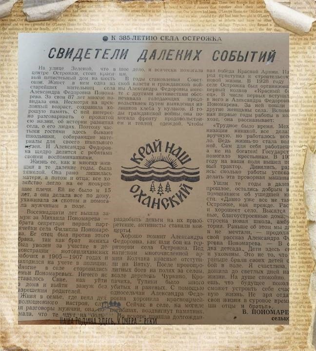 Источник: Знамя коммунизма.- 1982 Персоналии: Александра Фёдоровна Пономарёва, Михаил Пономарев, Филипп Пономарев На улице Зелёной, в самом центре Острожки, стоит красивый пятистенный дом на шесть окон. В нём живёт одна из старейших жительниц села – Александра Фёдоровна Пономарёва. За свои 87 лет она повидала многое. Несмотря на преклонный возраст, Александра Фёдоровна сохранила прекрасную память. С ней интересно беседовать о её жизни, об истории развития села, о его людях. Поэтому частыми гостями здесь бывают школьники, собирающие материалы для своего школьного музея. И Александра Фёдоровна щедро делится с ребятами своими воспоминаниями. Жизнь Александры Фёдоровны, как и многих женщин в те далёкие годы, была тяжёлой. Она рано лишилась матери, а затем и отца; всё хозяйство легло на её неокрепшие плечи. Ей не было и пятнадцати лет, а она уже делала всю домашнюю работу, ухаживала за скотом и помогала мужчинам в поле. В восемнадцать лет Александра вышла замуж за Михаила Пономарёва — брата