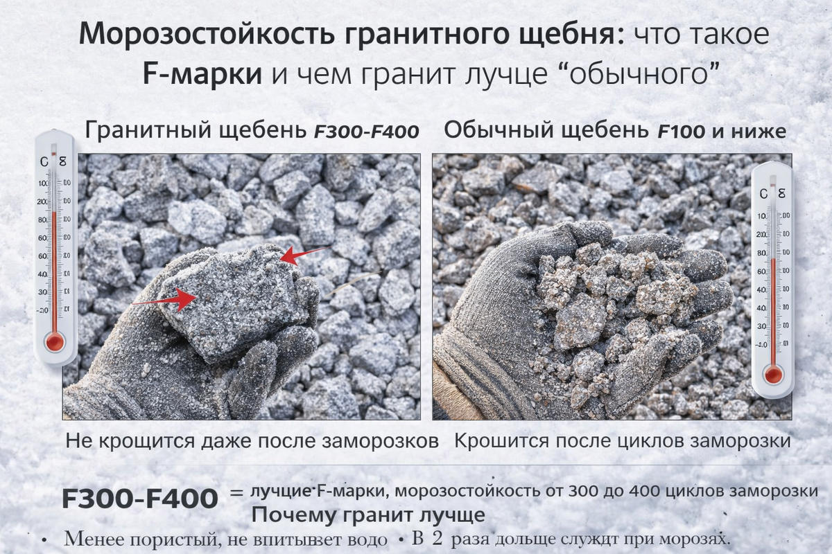 Ключевая разница для морозостойкости — структура породы и водопоглощение: (Смысл простой: замерзающая вода расширяется, порода с пористостью страдает сильнее.) Плюсы гранитного щебня: Минусы гранита: Плюсы известняка: Минусы известняка (по факту эксплуатации): Это не “единственно верно”, но это рабочая логика по рискам: ЗадачаРиск влаги/морозаРекомендуемая