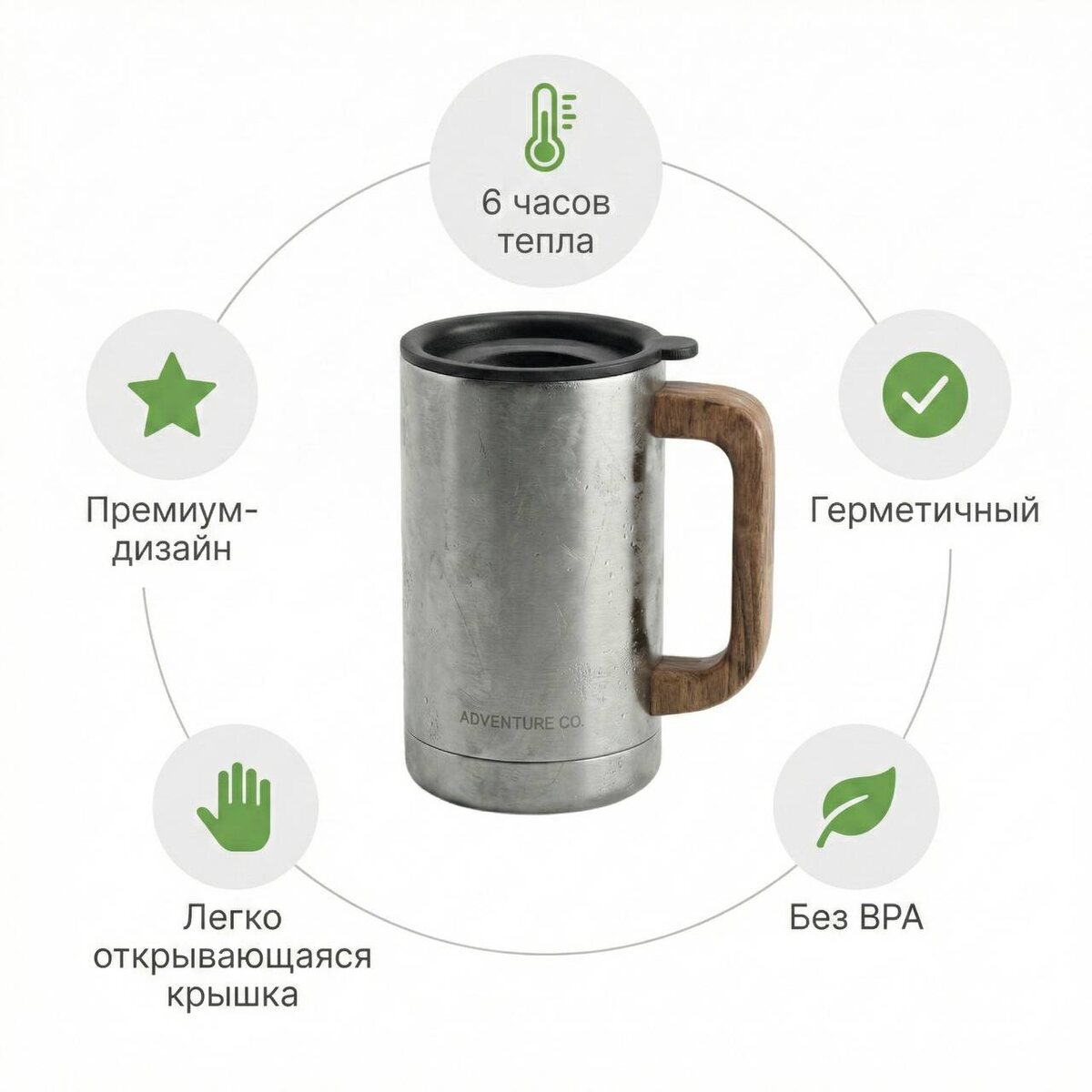Задача: показать 5 преимуществ термокружки (сохраняет тепло 6 часов, не проливается, экологичный материал, удобная крышка, стильный дизайн).