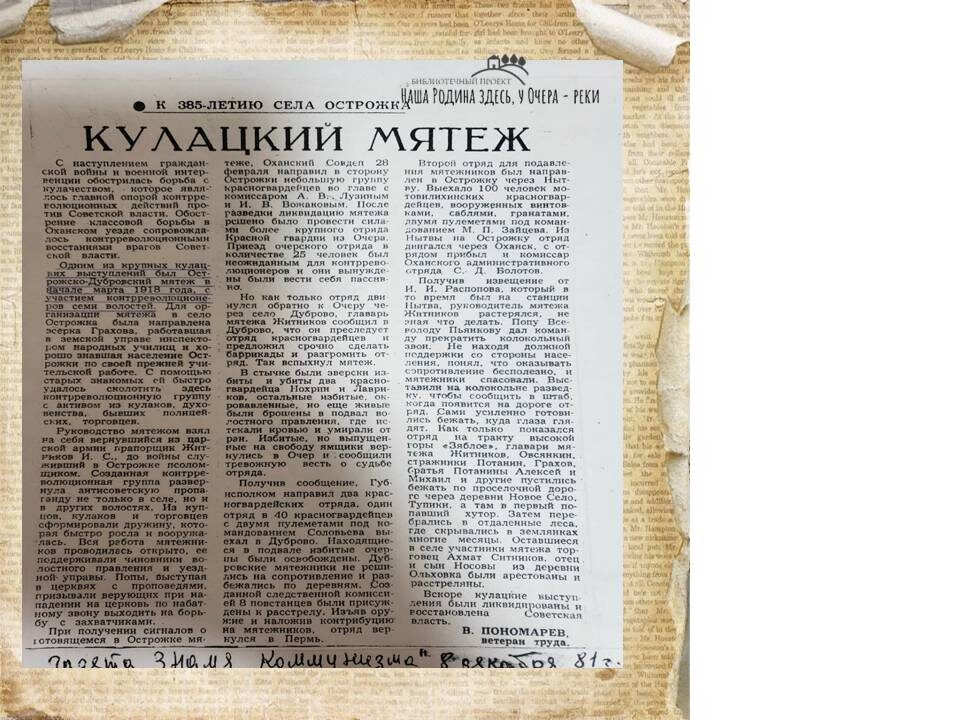 Источник: Знамя коммунизма.- 1981.- 8 декабря С началом Гражданской войны и иностранной интервенции обострилась борьба с кулачеством – главной опорой контрреволюции против Советской власти. Классовая борьба в Оханском уезде сопровождалась контрреволюционными восстаниями. Одним из таких крупных выступлений стал Острожско-Дубровский мятеж, начавшийся в марте 1918 года. В нем приняли участие представители семи волостей. Для организации мятежа в село Острожка прибыла эсерка Грахова. Работая инспектором народных училищ в земской управе, она хорошо знала жителей села по своей прежней учительской деятельности. Используя старые связи, Грахова быстро сформировала здесь контрреволюционную группу, в которую вошли кулаки, духовенство, бывшие полицейские и торговцы. Тем временем, для подавления мятежа в Острожку был направлен отряд из 100 красногвардейцев Мотовилихинского завода под командованием М. П. Зайцева. Отряд, вооруженный винтовками, саблями, гранатами и двумя пулеметами, двигался через Ныт