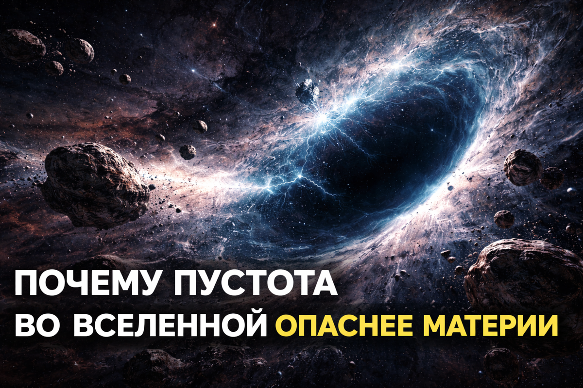 Когда мы думаем об угрозах во Вселенной, воображение рисует чёрные дыры, взрывы сверхновых, астероиды и радиацию. Всё, что связано с материей и энергией. Но парадокс в том, что одна из самых опасных вещей во Вселенной — это не материя, а пустота. Причём не философская, а вполне физическая. В популярном представлении вакуум — это просто отсутствие всего. На самом деле квантовая физика говорит обратное. Даже в идеально пустом пространстве постоянно рождаются и исчезают виртуальные частицы. Это кипящая, нестабильная среда, наполненная энергией. Именно эта «пустота» определяет, как ведут себя частицы, поля и даже сама структура пространства-времени. Более 95% объёма Вселенной занимают гигантские пустоты — войды. Это области, где почти нет галактик, звёзд и материи. Они не просто пассивный фон, а активные элементы космической структуры. Галактики формируют нити и скопления, а между ними — огромные зоны разреженности. И именно эти пустоты управляют расширением Вселенной не меньше, чем матери