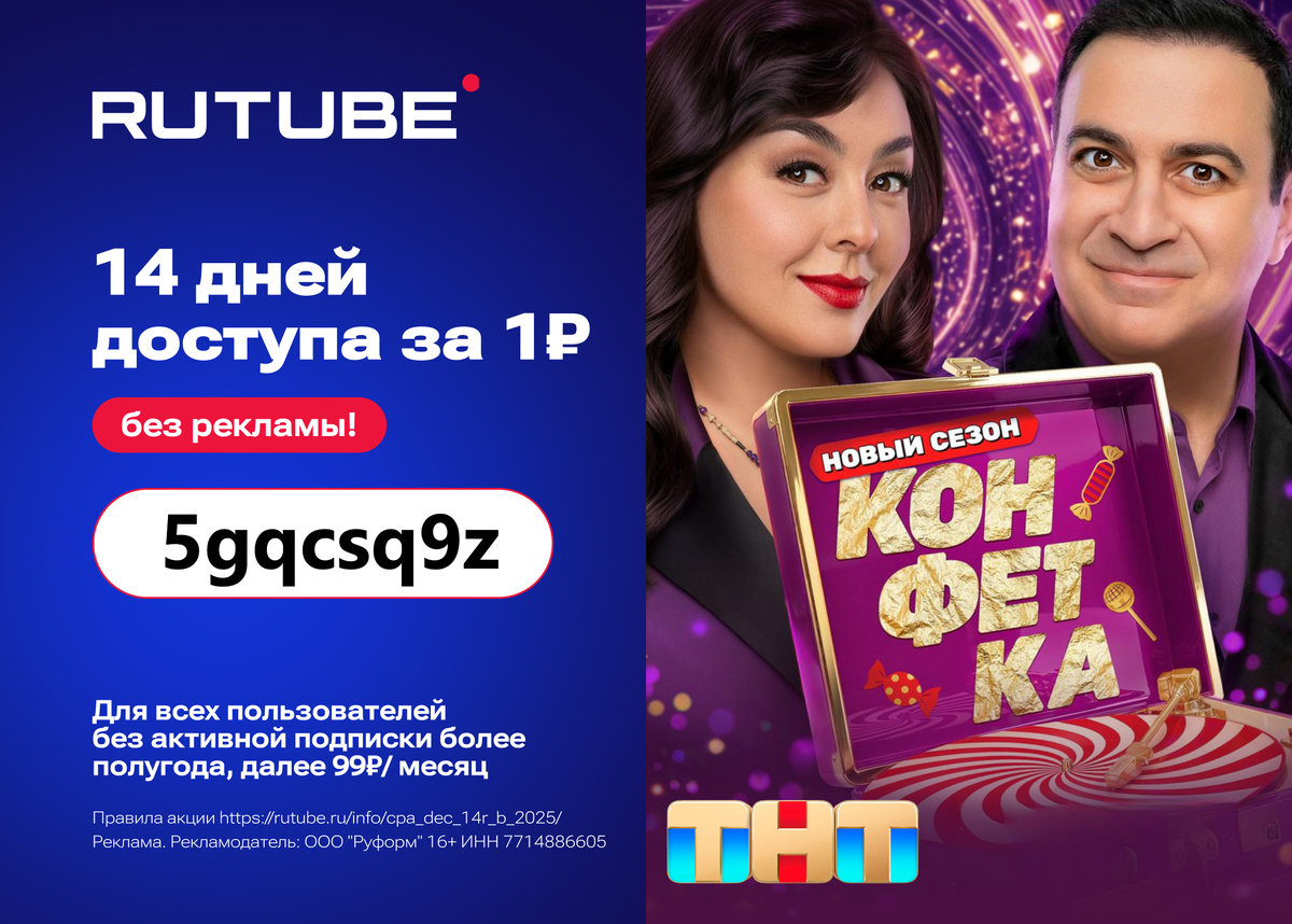вводите промокод 5gqcsq9z, который дает 14 дней* за 1 ₽ доступа к RUTUBE без рекламы! *для всех пользователей без активной подписки более полугода Смотреть RUTUBE удобно на Smart TV — включайте любимые шоу и фильмы на большом экране. Реклама. Рекламодатель: ООО "Руформ" 16+ ИНН 7714886605 erid: 2VtzqxdVRVd