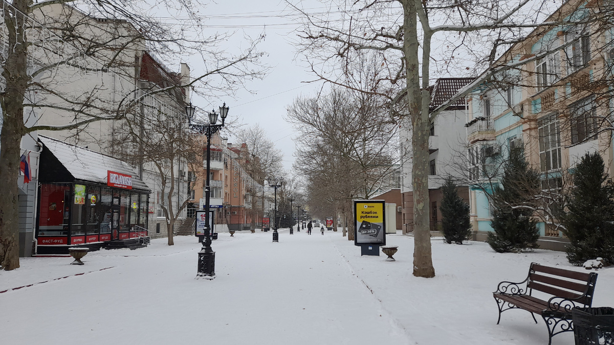 У нас снова плюсовая температура, и город постепенно возвращается к своему обычному облику зимой. Обычный облик - это серость и слякоть. Поэтому особо приятно вспомнить, как было красиво всего несколько дней назад, когда к нам пришла настоящая зима с морозцем и снежком. О прогулке по заснеженной Керчи я рассказывала здесь. Тогда я прогулялась к Морвокзалу и вернулась из-за очень сильного ветра. На следующий день я оделась потеплее и прошлась по центральной улице Ленина с заходом в сквер Володи Дубинина до самой набережной. Улица Ленина у нас пешеходная, поэтому укрыта чистеньким белым снежком, в отличие от проезжей части, где снег превратился в тёмно-серую противную кашу. В сквере Володи Дубинина тихо и красиво. Обычно занятые лавочки сегодня пустуют) Как хорошо, что до сих пор не убрали новогоднюю ёлку! В заснеженном пейзаже она выглядит действительно по-зимнему и новогоднему! Инсталляция, напоминающая нам о наступлении 2026 года) С центральной городской площади открывается прекрасн