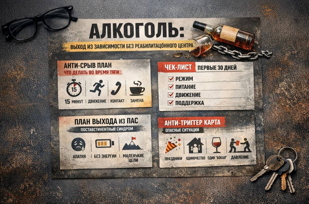 Без реабилитационного центра. По системе. Я много лет работаю с людьми, которые не хотят ложиться в реабилитационный центр, но хотят реально выйти из алкогольной зависимости, а не «продержаться пару недель». Главная ошибка это надеяться на силу воли. Но алкоголь это не про характер, это про: 🧠 сломанную систему дофамина 🫢 триггеры 🤯 стресс 🤔 окружение 🫠 постабстинентный синдром Поэтому я собрал чёткий и понятный алгоритм, который можно применять дома. Без мотивационных лозунгов. Без «поговори с собой». Без дурацких советов из серии «просто не пей». 📌 ЧТО ВНУТРИ 1️⃣ Анти-срыв план Что делать, когда накрывает тяга, а не «потом». Пошаговый алгоритм на 15 минут, чтобы не сорваться. 👉 Скачать: 🔗 [ссылка на Анти-срыв план] 2️⃣ Чек-лист на первые 30 дней Чёткий список действий: 🔄 режим 👍 сон 😌 питание 🥹 поддержка Чтобы человек не потерялся в хаосе и видел прогресс, даже когда тяжело. 👉 Скачать: 🔗 [ссылки на чек-лист 30 дней] 3️⃣ План выхода из постабстинентного синдрома