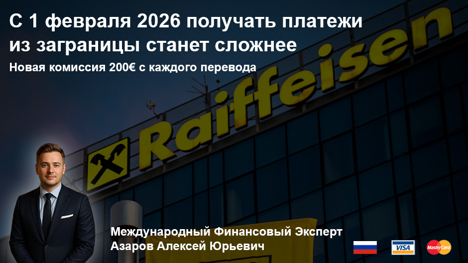 ℹ️ Автор статьи Азаров Алексей - международный финансовый эксперт. Провожу бесплатные консультации для клиентов по вопросам международного банкинга, пишите в любое время на телеграмм. Доступен клиентский чат с отзывами. Создатель крупнейшей базы знаний зарубежных банков. Ключевой факт: с 1 февраля 2026 года любой перевод через венский Райффайзенбанк будет облагаться фиксированной комиссией 200 евро вне зависимости от суммы. Для кого это критично: Почему это болезненно: Рассмотрим на примере: Для семей, зависящих от таких переводов, это означает: Существует проверенный способ минимизировать потери — открытие карты в банке стран СНГ. Вот как это работает: Преимущества решения: Пошаг
