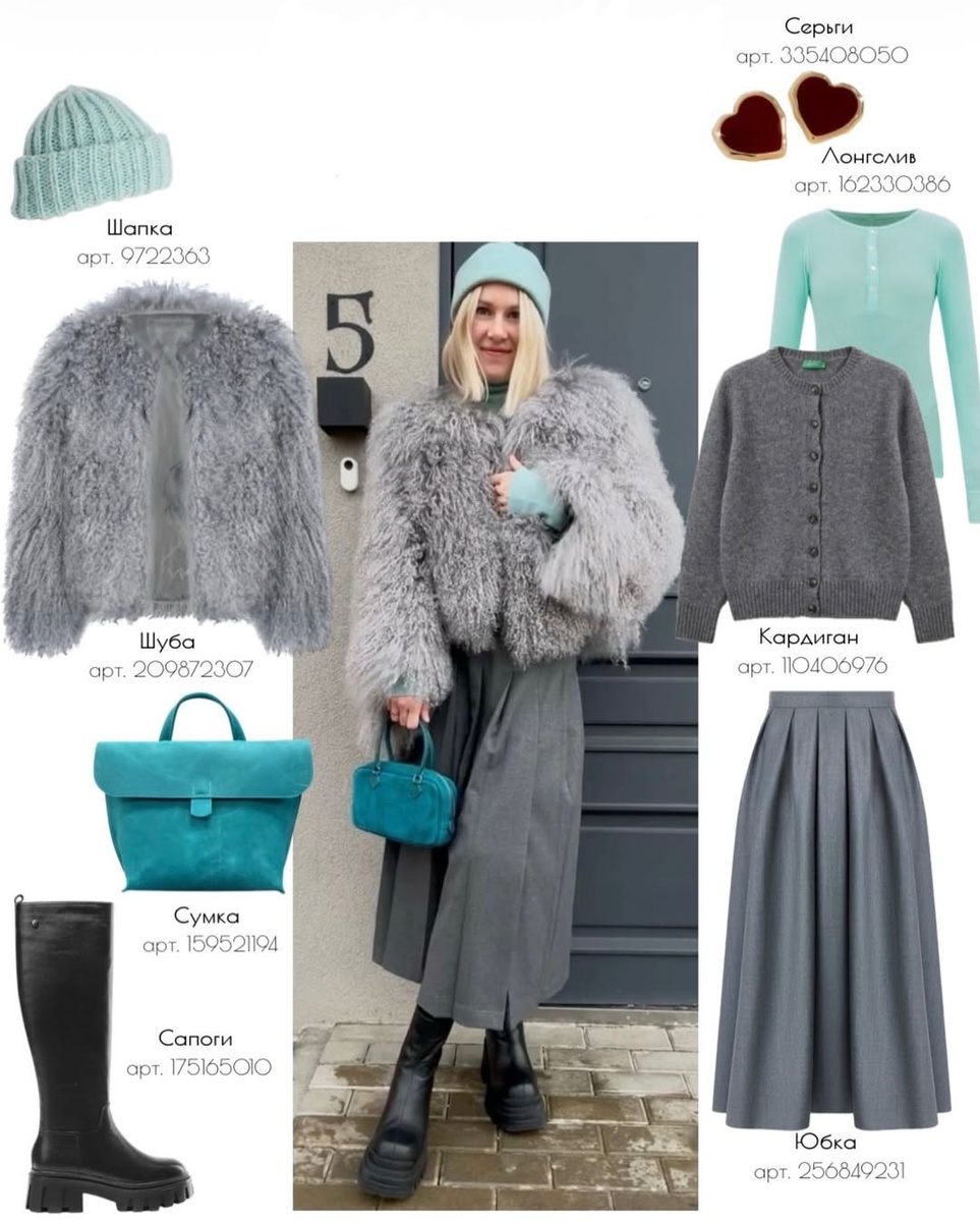 Этот образ — смелый, запоминающийся и при этом удивительно гармоничный. В нем соединились холодные пастельные оттенки, выразительные фактуры и немного наивной женственности. Серый, мятный и бирюзовый звучат свежо и нестандартно, а грубая обувь и объемная шуба добавляют характер. Такой комплект невозможно не заметить — он выглядит как тщательно продуманная стилистическая история.