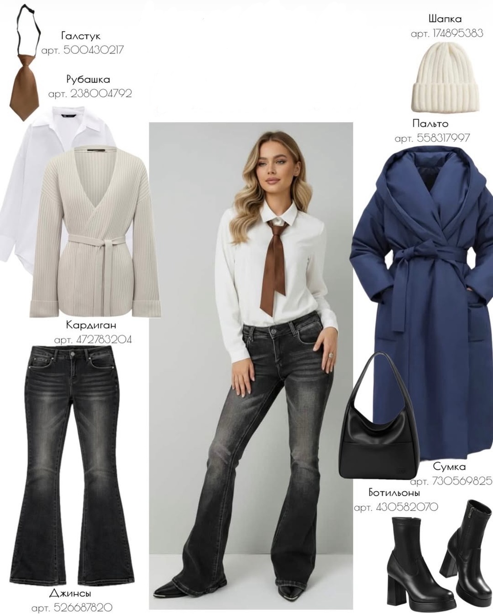 Этот образ — про уверенность без излишней демонстративности. Он словно собран из классических элементов, но подан современно и свежо. Белый, молочный, шоколадный, глубокий синий и черный создают благородную палитру, которая всегда выглядит уместно и дорого. Такой комплект легко представить и в деловой среде, и в повседневной городской жизни — он универсален, продуман и очень стильный.