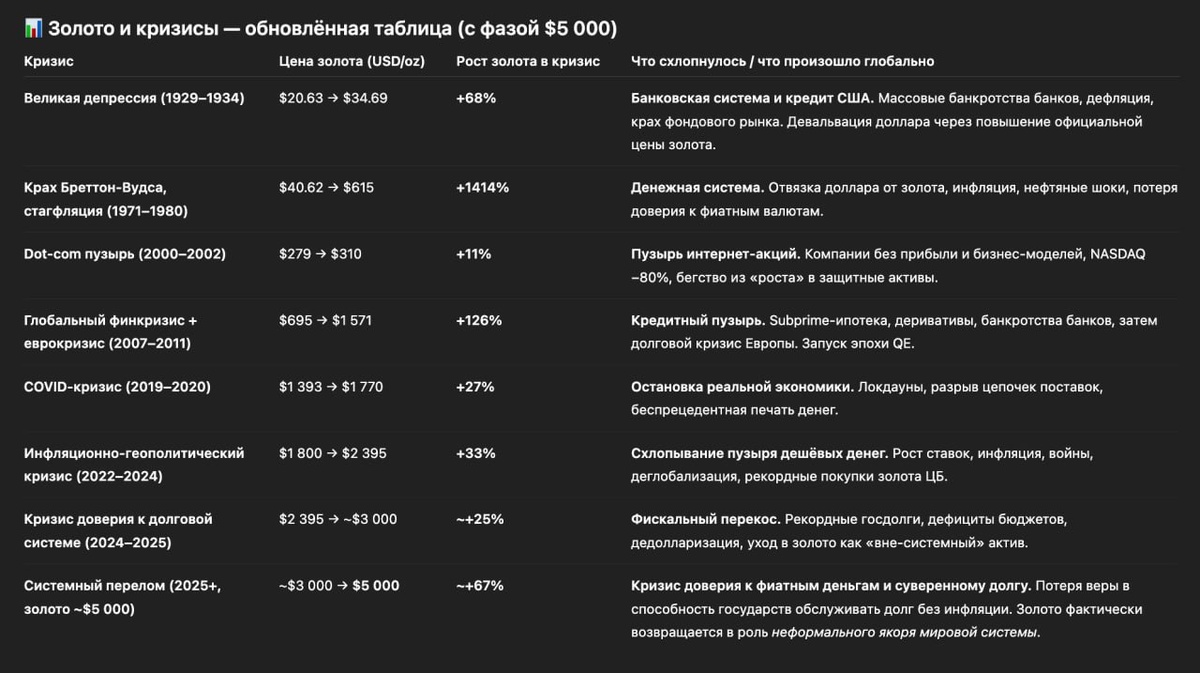 Все мои мысли делите на 10. Читаю сейчас "Принципы" Далио. Мужик грамотный. Рекомендую всем посмотреть его труды (книги, видео). Запомнил несколько важных вещей: — везде есть зависимости, если их нет, ты просто их не нашел (это прекрасно перекладывается на ведение ОП при работе с товаром) — все циклы повторяются потому что люди забывают про зависимости, умирают не передавая знания, не любят изучать историю (с каждым поколением люди все меньше изучают историю, а значит и циклы повторяются быстрее) — публичным заявлениям по поводу финансов верить никогда нельзя (вроде простая истина, но когда приводят примеры становится еще яснее) Сейчас, как вы знаете, что-то происходит во всех рынка и никто не понимает что) Но мы знаем одно: если люди покупают золото, то точно что-то скоро рухнет. Только вот что? На скрине все недавние кризисы и как вело себя золото в них. Поизучайте, если есть какие-то конструктивные мысли — пишите. (Вот меня возит от роддомов к финрынкам😂) 🔴 После этого пос