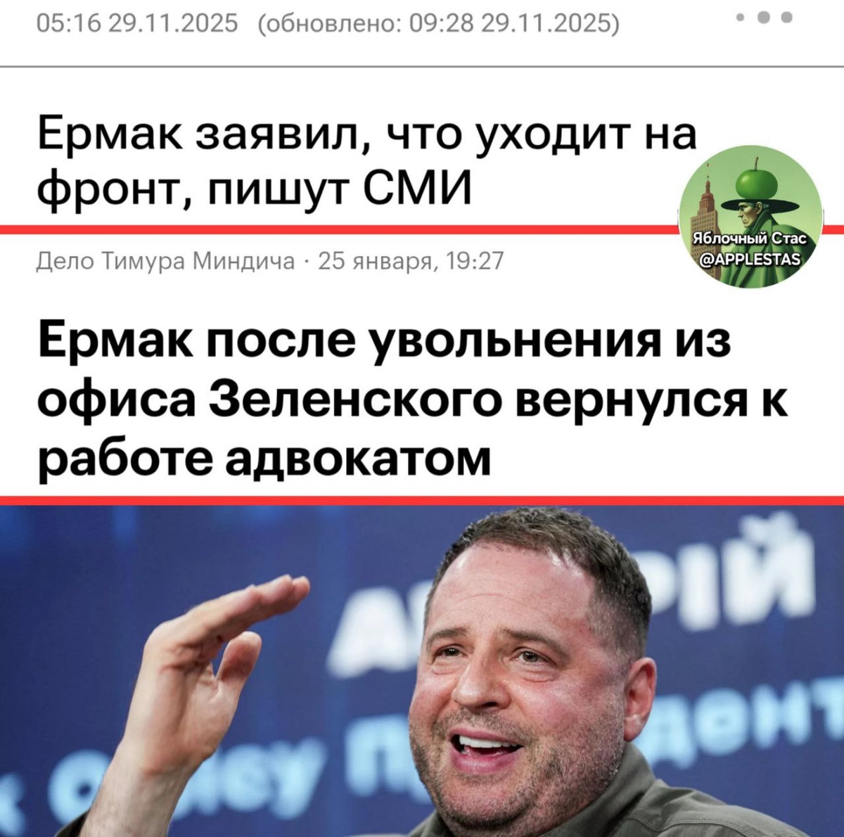 В одних трусиках и вышиванке, как простой патриот. Нес украиньски прапор, целовал его. Но заблудился. Простыл, потом заболел. Вот и пришлось временно стать адвокатом. Сейчас подлечится – и в бой. Яблочный Стас