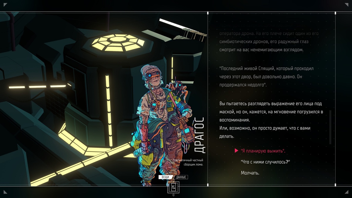 Эдакая настолка с кубами, циклами и ивентами + упор на сюжет. Citizen Sleeper. По HLTB проходится за 1,5-2 часа, но, думаю, я тут даже задержусь на несколько прохождений и попробую всех трёх персонажей.