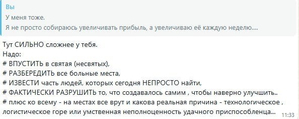 У меня глаза на лоб полезли от таких представлений о моей работе. Я уже писал пару месяцев назад, что моя работа на проектах проходит в тиши кабинета диспетчерской. Я там сижу неделями, плету сети управления. Иногда зову к себе начальников участков, чтобы они помогли мне создавать маршрутные карты. Через месяц диспетчер просто начинает выдавать те же сменные задания, но подчинённые новому алгоритму планирования (10 правил работы конвейера). И не надо меня ВПУСКАТЬ в святая-святых. И ничего я не буду БЕРЕДИТЬ. И никого не собираюсь ИЗВОДИТЬ. И ничего не буду ФАКТИЧЕСКИ РУШИТЬ. Я просто сплету сеть управления и научу диспетчера ей пользоваться, а руководителей производства выполнять сменные задания и своевременно их комплектовать всем необходимым. И да. За счёт моей тихой, незаметной работы, почти без усилий со стороны собственника, предприятие увеличит выручку и прибыль. Усилий от собственника требуется на столько мало, а моя работа бывала на столько незаметной, что иногда мне говорили,