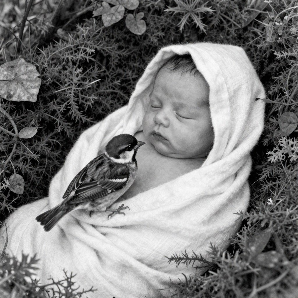 На траве сидит, прикрывши глазоньки. Так сидели долго. Птичка малая
