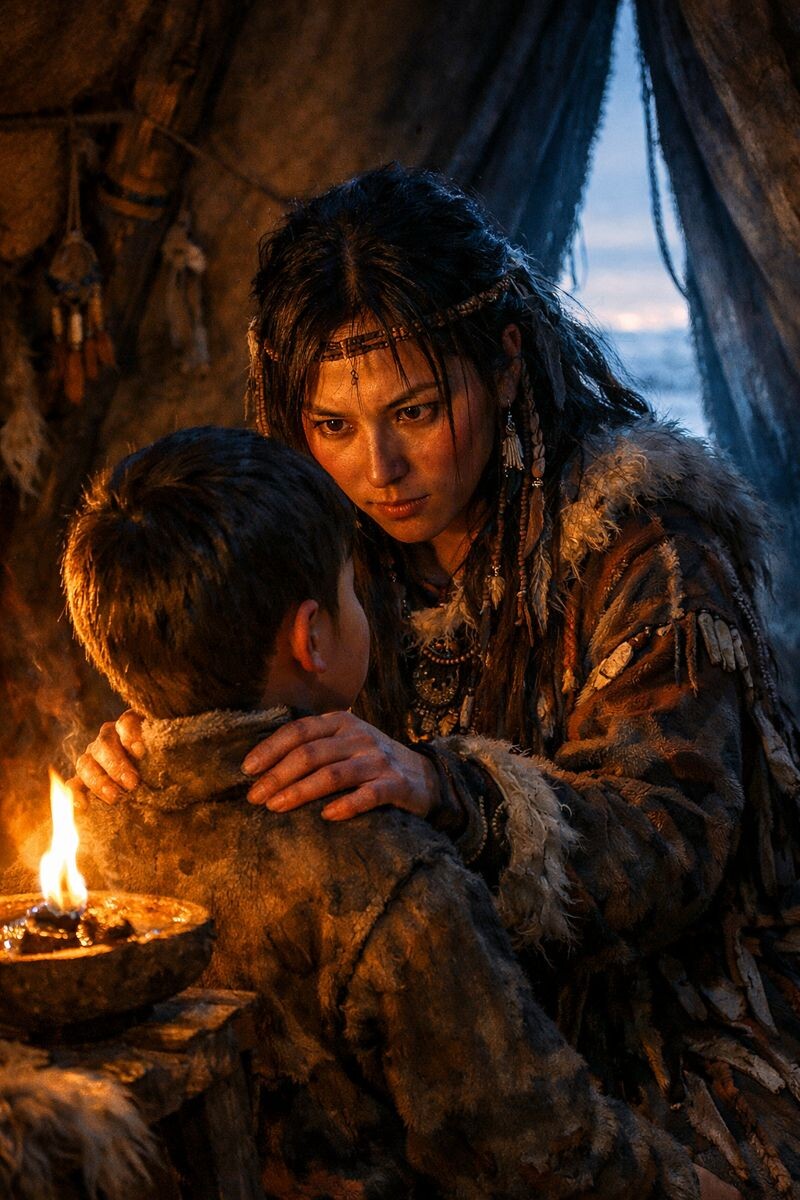 Часть 3: Ледяной урок Именно этот иней — серебристую паутину забвения — первой заметила Айта, мать Айана и последняя в их роду, у кого ещё тлел дар видеть. Той ночью она не спала. Чувствовала смутную тяжесть в воздухе, будто небо опустилось слишком низко. Вышла перед рассветом — и обомлела. Вся низина за стойбищем сияла холодным, фосфорическим светом. Не просто иней. Дыхание. Она развернулась, быстро вошла в чум, где спал её сын. Не стала будить его грубо. Села рядом, положила ладонь ему на лоб. Он проснулся от её прикосновения, тихого и твёрдого. — Вставай, — сказала она без предисловий. — И молчи. Он, завороженный серьёзностью в её глазах, послушался. Она вывела его на улицу, к самому краю той серебристой поляны. Утренний ветерок ещё не начался, и узоры лежали нетронутыми, совершенными в своей ледяной красоте. — Смотри, — прошептала Айта, и её голос звучал как скрип снега. — Видишь этот блеск? Это не наше. Это дышали те, кто под землёй. Сихиртя. Айан, мальчик с живым умом, привыкший