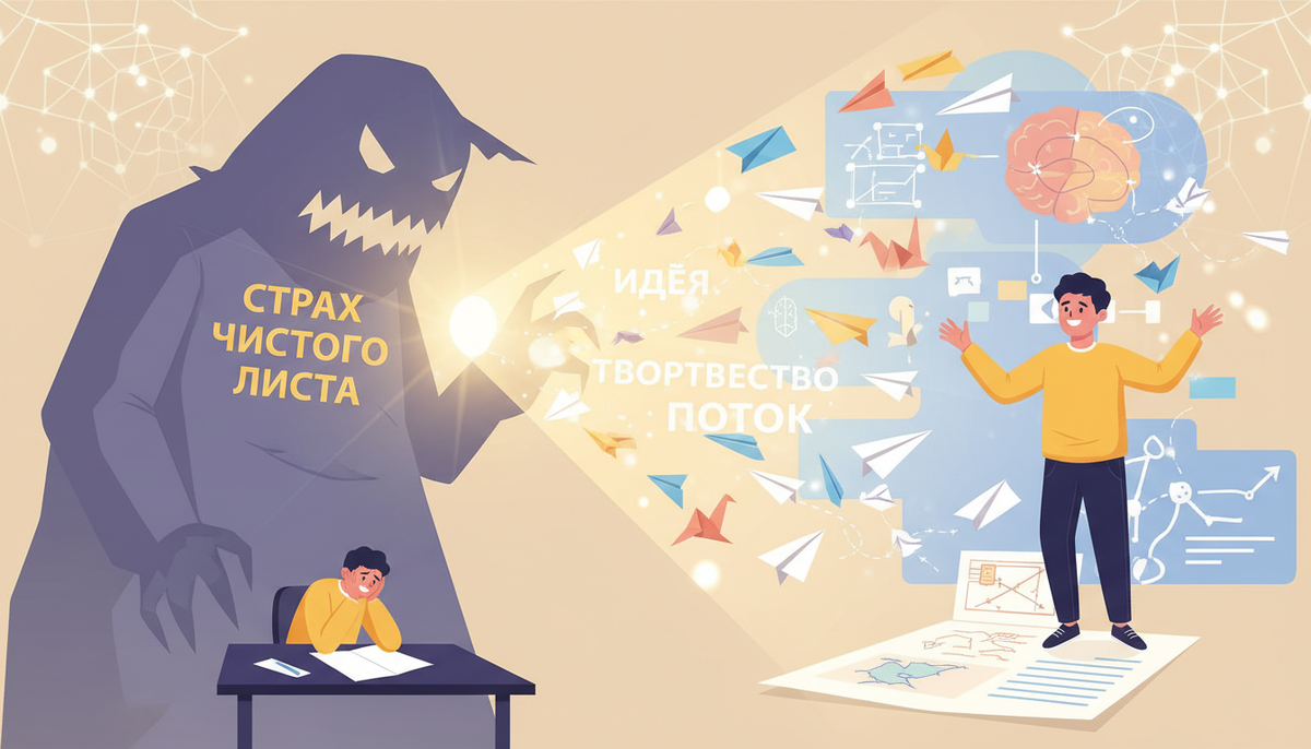 Представьте, что ваш ум это фабрика. В одном цеху рождаются сырые, необработанные мысли, образы, слова это генеративное мышление. Его задача производить, не задумываясь о качестве. В другом цеху сидит строгий редактор, который оценивает, критикует, исправляет и часто выбрасывает в корзину всё, что кажется недостаточно совершенным. Страх чистого листа возникает в тот самый момент, когда внутренний критик врывается в цех генерации с криком и заявляет что это недостаточно гениально!, по его мнению всё и сразу должно быть идеально! и нажимает на аварийный стоп. Конвейер останавливается, и на выходе снова пустота. Эта фраза работает, потому что снимает с нас груз вины. Мы перестаём корить себя за пустоту в голове и начинаем видеть истинную причину, а именно сбой в координации внутренних процессов.