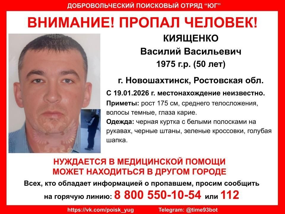 ! #Киященко Василий Васильевич, 1975 г.р. (50 лет) #Новошахтинск , #Ростовская область С 19.01.2026 г. местонахождение неизвестно. Инфорг поиска: Евгения +79185765262 Всех, кто обладает информацией о пропавшем, просим сообщить по телефону бесплатной горячей линии 88005501054 или 112. Если вы готовы помогать в поиске пропавших без вести, приглашаем присоединиться к телеграм-каналу https://dzen.ru/id/651d5d9f1cf2387b25bdca70