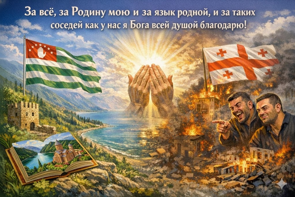 Я искренне и безгранично выражаю Богу глубочайшую благодарность за всё, что имеет мой горячо любимый абхазский народ. Я благодарю Его за Абхазию. За Родину моего народа, которая является самым лучшим уголком Кавказа. Я благодарю Всевышнего за абхазский язык. Тайны моего родного языка пока что не раскрыты, но, когда раскроются эти тайны, в мире начнётся повальное увлечение абхазским языком, как после выхода на экраны фильма «Аватар» люди повсеместно стали изучать язык На'ви, вымышленный язык, разработанный профессиональным лингвистом Полом Фроммером для фильма Джеймса Кэмерона «Аватар», выпущенного в 2009 году. Многие абхазы, наверное, думают, что абхазский язык с его невероятной сложностью является проклятием абхазского народа. О-о, нет, никогда так не думайте! Бог специально создал абхазский язык таким сложным, чтобы ограничить численность избранных людей, которые владеют им. Как ни парадоксально, степень любви Бога к тому или иному народу определяется степенью сложности их языка. Сам