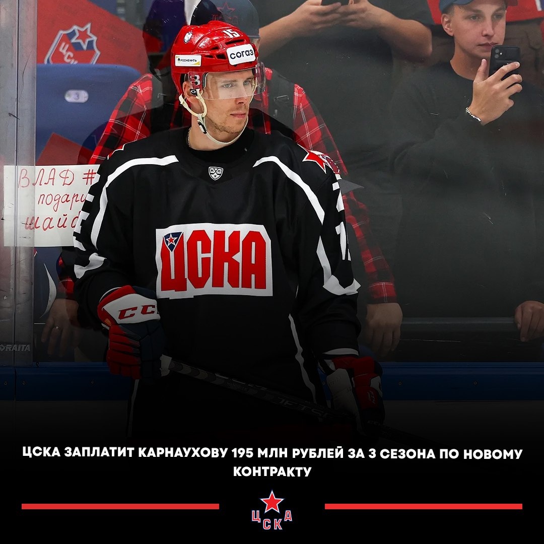 ✍️ В воскресенье московский клуб подписал новое соглашение с нападающим до 31 мая 2029 года. 🚨 Карнаухов выступает за ЦСКА с 2016 года. В нынешнем сезоне 28-летний форвард провел 49 матчей в Чемпионате КХЛ и набрал 21 (9+12) очко.