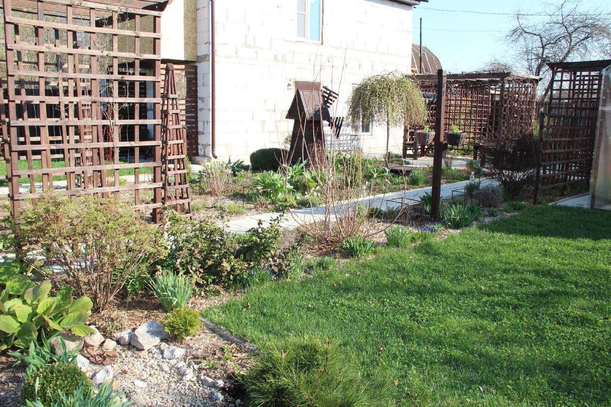 В 2022 году мы сделали сухой ручей. Через него перекинули мостик, а позже там появился еще и японский фонарь. Берега я решила обсадить карликовыми видами хвойных и растениями в природном стиле. Здесь растут баданы, самшит, горная сосна, карликовая пихта На-На, шаровидная туя Даника, лилейники, сибирские ирисы, вероника, армерия, флокс растопыренный, ге...ры, примула, тюльпаны, нарциссы. У арки посажены два княжика Пурпл Дрим. Были еще злаки, но зная наглость этих растений, я посадила их в контейнерах. Такие условия им не понравились и расти в них злаки отказались. Сейчас вспоминаю как я выкорчевывала взрослый куст колосняка песчаного в другом цветнике и думаю, что все это к лучшему. Он у меня рос с пятилитровой пластиковой бутылке с отрезанным горлом. Со временем колосняк пробил корнями стенки и пошел гулять по всему цветнику. Прорастал даже между плитками. Два года с ним потом боролась. Мне хотелось, чтобы цветение в миксбордере было, но не такое активное, как в остальном саду. В са