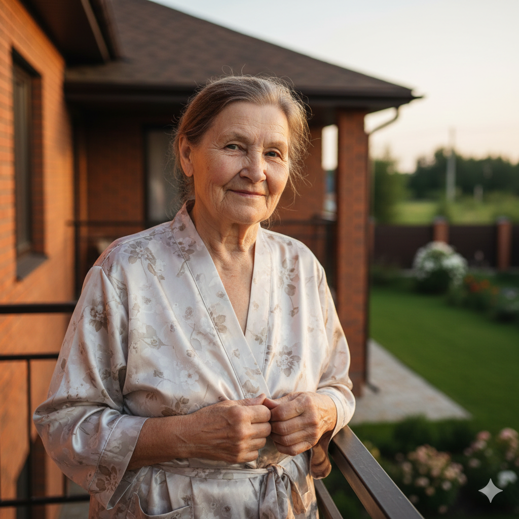Клавдия глянула на халат — шелковый, с цветами, блестит. Дорогой, городской, а ей неловко: «куда уж мне в таком». Она тихо вздохнула, поправила чашку на подоконнике. Комната — просторная, светлая, на стене фотографии: сынок в мундире ещё с армейских лет, внук с медалью за плавание, и она сама — в платке, в саду. Улыбается. А ведь жизнь-то прошла, как один день. Родилась Клавдия в маленькой деревне, росла без отца. Мать тянула всех четверых, как могла — огород, козы, да колхозные поля. Клавдия с малолетства знала: если не поработаешь, никто не подаст. Едва школу закончила — пошла дояркой. Молока то