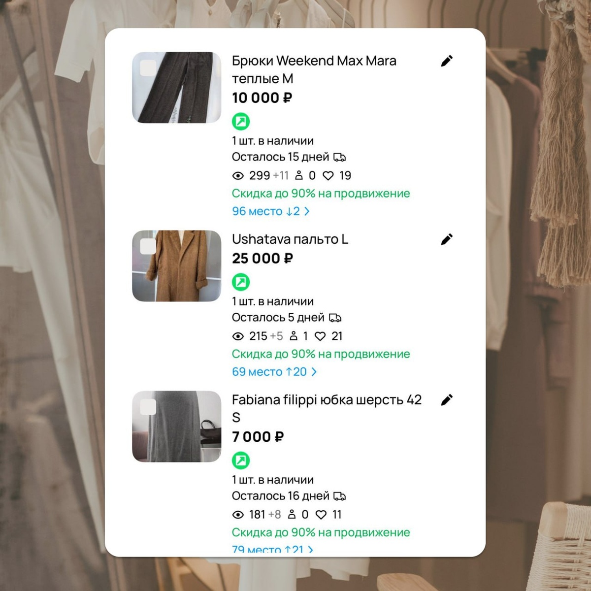 У меня всегда неплохие органические просмотры. Без вложений вполне можно получать результат. Но когда авито дает скидку на продвижение 70–90%, иногда я этим пользуюсь Просмотры ➡️выбираю по фильтру 7-10 объявлений с высокими просмотрами; ➡️покупаю на 1–7 дней и стоимость по ситуации • на дорогие товары — средняя цена и дней на 5-7, такие товары покупают не сразу, нужно время для принятия решения • на недорогие товары — минимальная цена и срок, просто чтобы добавить просмотров Покупать просмотры на объявления с нулем просмотров бессмысленно, они не прибавятся Продавала очки Tom Ford за 20 т.р. Просмотры были, но продажа не шла. Поставила продвижение на 7 дней по средней цене, сразу пошли сообщения, и через три дня очки купили Когда покупала просмотры на свитера или платья по 3-7 т.р., просмотры тоже росли и продажи ускорялись Но бывало, что поставила продвижение, но продажи не состоялись. И это тоже результат — раскачала профиль. Не эти товары, так другие покупают ➡️Из платных