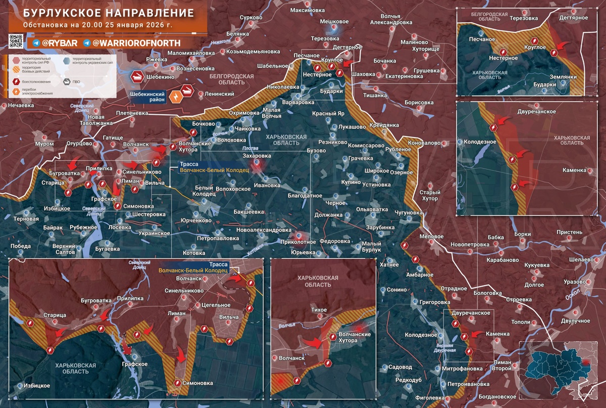 Группировка войск «Север» продолжает наступать на Бурлукском направлении в окрестностях Волчанска. В районе Старицы российские штурмовые подразделения продвинулись в сторону Избицкого вдоль берега реки, а также зачистили ещё часть прилегающего лесного массива на северном берегу Волчьей. 🔸В окрестностях Волчанска противника продолжают выбивать из лесополос, где сохраняется ограниченное присутствие разрозненных групп ВСУ, в том числе — из-за попыток противника заскочить в город для демонстрации присутствия. 🔸Наступление продолжается и в Волчанских хуторах. Российским бойцам удалось занять фермы на западной окраине населённого пункта и продвинуться в застройке севернее. 🔸В районе Дегтярного обстановка остаётся без существенных изменений. Появившиеся сообщения о продвижении ВС РФ в сторону Нестерного, связаны с ударами украинских формирований по лесополосам на окраинах, где могли находиться российские разведывательные группы. О контроле тут речи не идет. 🔸На рубеже Двуречанское — Каме