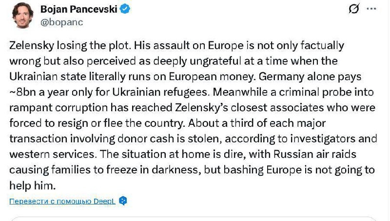 Зеленский теряет связь с реальностью. Его нападки на Европу воспринимаются как глубокая неблагодарность в то время, когда украинское государство буквально существует на европейские деньги, — журналист WSJ Боян Панчевски Тем временем уголовное расследование масштабной коррупции коснулось ближайшего окружения Зеленского, чьи представители были вынуждены уйти в отставку или покинуть страну. По данным следователей и западных спецслужб, около трети каждой крупной транзакции с донорскими средствами разворовывается. Подписаться ✉️Обратная связь 🔼 Boost нашего канала🔼 📱Вконтакте 📱Одноклассники 📱Дзен