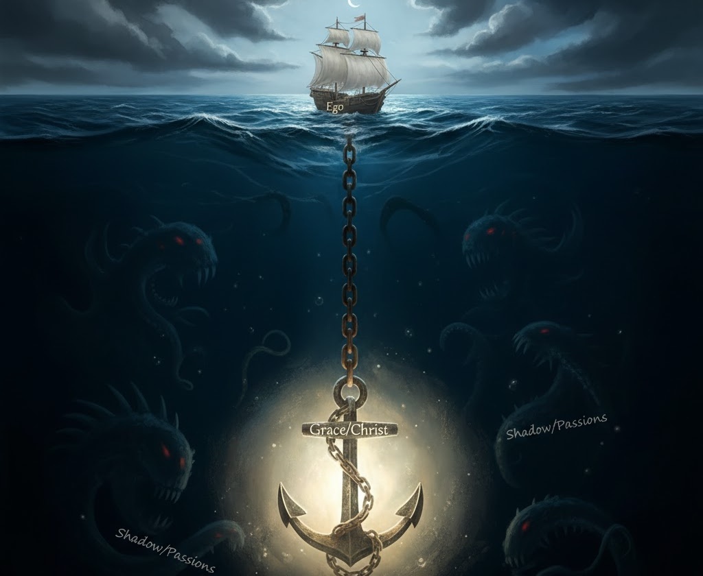 Это не просто интеллектуальное самокопание, а глубокая трансформация: выдерживать такие переживания помогает развитое "эго" — осознанная часть психики, способная наблюдать и интегрировать эти силы без разрушения. В христианском контексте эта опора усиливается теистическим измерением: Бог как абсолютный Центр, источник Любви, становится якорем в бурях. Здесь можно провести параллель: опора на себя в психологии часто трактуется как подлинная любовь к себе, но в православии эта любовь сливается с Божественной Любовью, как сказано в Первом послании Иоанна: "Бог есть любовь, и пребывающий в любви пребывает в Боге, и Бог в нем" (1 Ин. 4:16). Таким образом, в глубинах психики истинное само-принятие питается из этого Божественного источника, предотвращая нарциссизм или самообман.