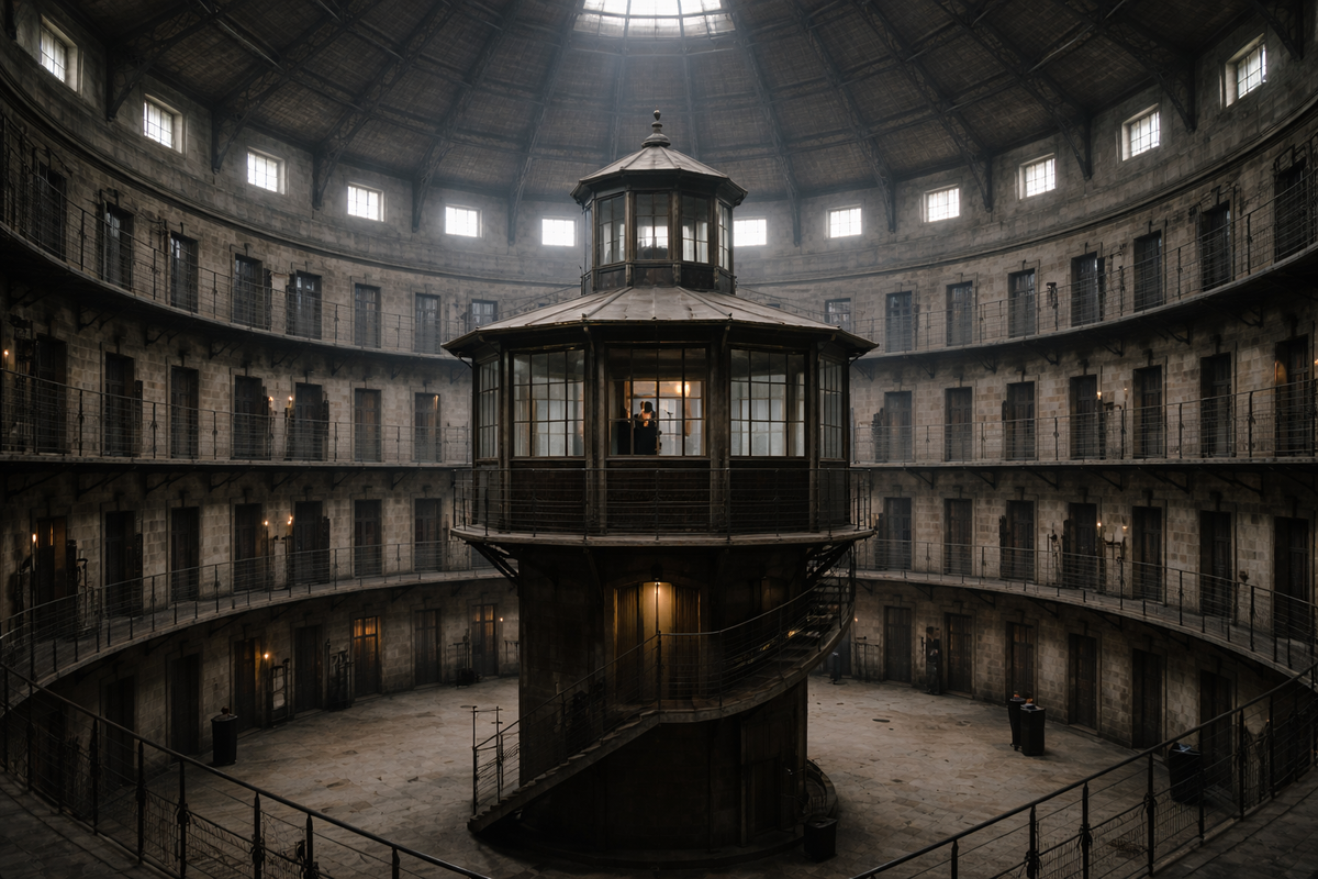В 1791 году английский философ Иеремия Бентам предложил парламенту проект идеальной тюрьмы. Круглое здание. В центре — башня надзирателя. По кругу — камеры заключенных. Каждая камера просматривается из башни. Но заключенный не видит, смотрят на него или нет.