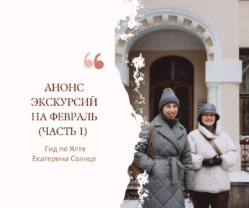 ▪️ Запись по полной предоплате только в личных сообщениях @kathi_crimea . Ни в коем случае не пытайтесь записаться в комментариях, вам тут же могут написать мошенники. ❌ ❌ ❌ мест нет📍5 февраля 2026 года, 17.00-18.30 - лекция «Уроки истории: Ялта-45» в баре «Душечка» (18+) Вы узнаете почему конференция проходила в Ялте; какие дворцы заняли делегации СССР, США и Великобритании; зачем Рузвельт и Черчилль взяли с собой дочерей, почему дочери американского посла не понравились интерьеры Ливадийского дворца; что ели и пили участники встречи и мн. др. Посмотрите: уникальные кинохроники и фотодокументы Ялтинской конференции. 📱Стоимость участия : 2000 рублей. ☕Отдельно оплачивается по желанию заказ в баре по меню. Количество мест 10-12. 📍8 февраля 2026 года, 12.00-14.30 - экскурсия в Алупкинский дворцово-парковый комплекс «Эпоха романтизма в архитектуре и парковом ландшафте. Судьба выдающегося генерал-губернатора Новороссии – Михаила Воронцова» (14+) Вы увидите единственный в мире двор