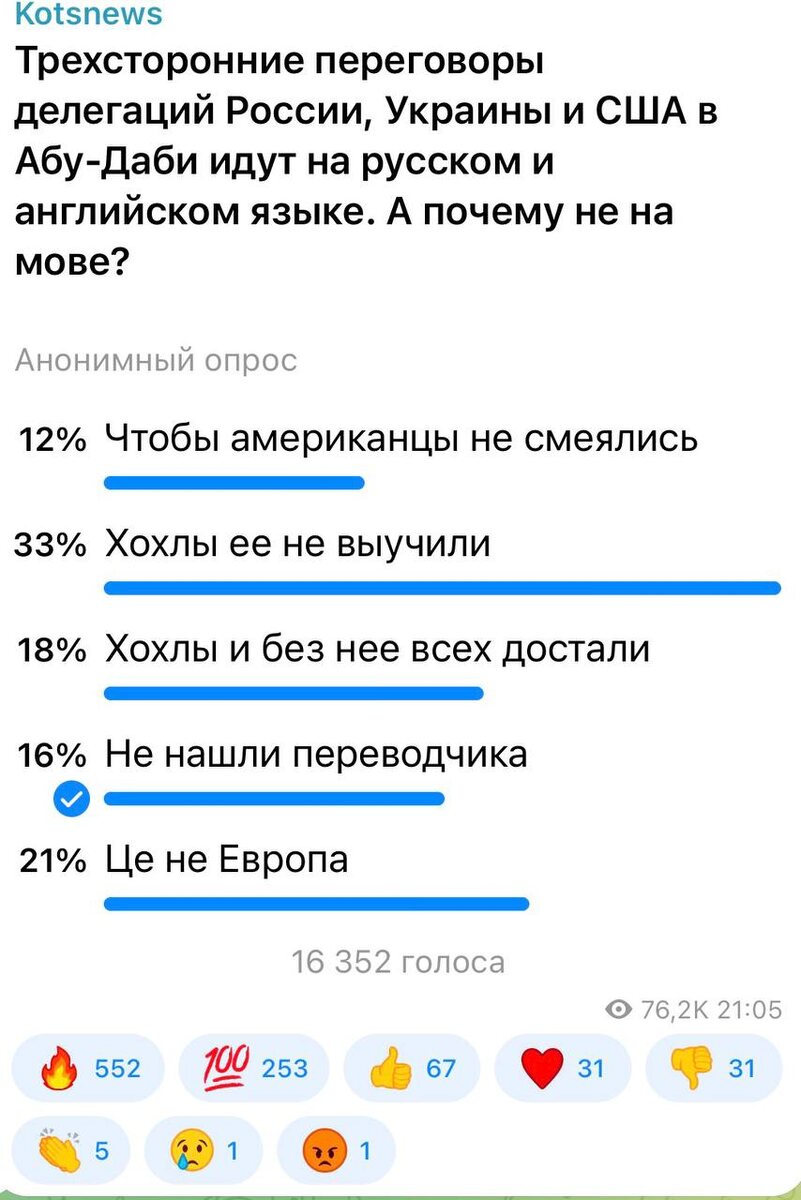 ⚡️⚡️⚡️ 33 процента подписчиков считают, что украинская делегация просто не выучила мову. Судя по всему, они и на русском понимают туго.