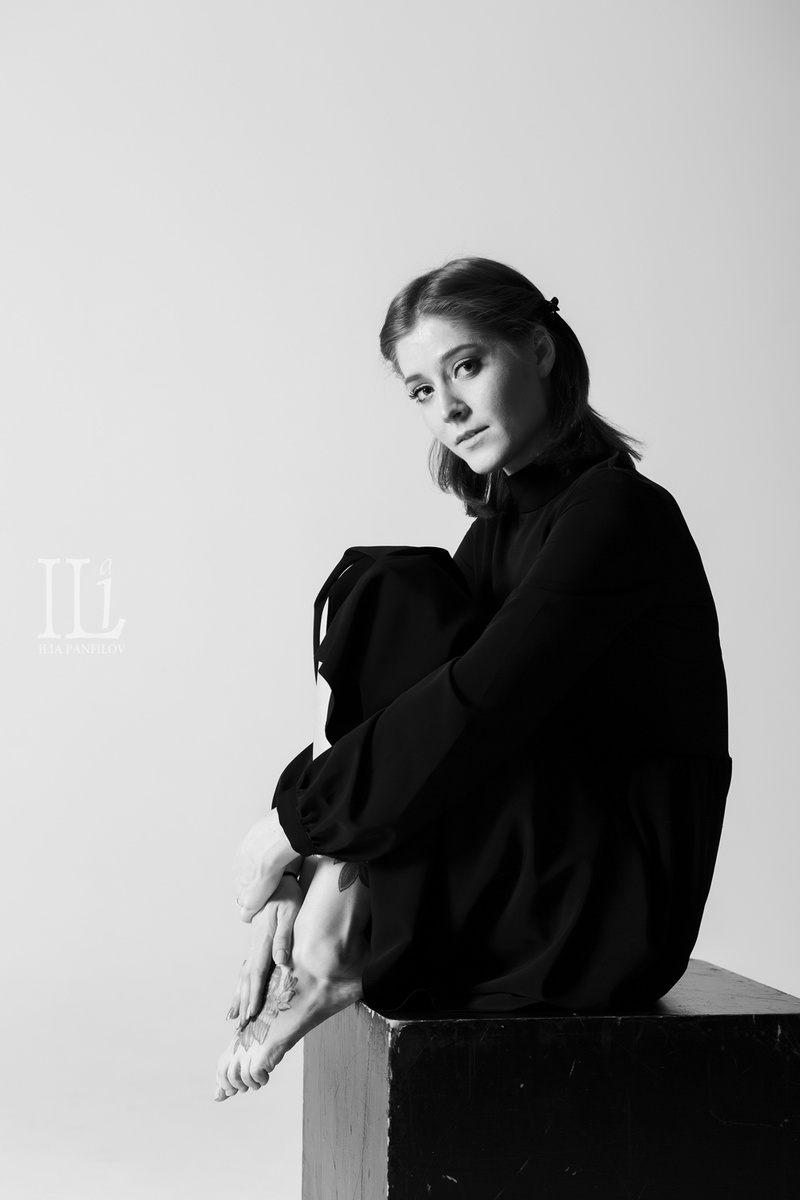 Возможно, посмотрев на фотографии, вы вспомните ту самую фотосессию для Vogue, где актриса в чёрном платье, резко контрастирующем с её белокурыми волосами, ослепительно на белом фоне. Та самая серия Берта Штерна, известная, знаковая, ставшая для неё последней. Но я не люблю дословное цитирование изображений. Хотя, чего уж скрывать, бывало и руки «завязывал узлом», как на одной знаменитой картине, и ставил модель с листом у окна, как у другого гения. Но каждый раз, «воруя» идею, её всё равно приходится делать своей. Иначе это уже не диалог с историей, а просто копия. Так и здесь, важно было не повторить, а передать собственное настроение и то внутреннее ощущение, которое когда-то зацепило в той съёмке. Глубокие провалы чёрного цвета, словно кляксы густых чернил. Свет, который не украшает, а подчёркивает. Тишина кадра. И при всём этом – женственность. Хрупкая, неочевидная, без глянца и кокетства. Т