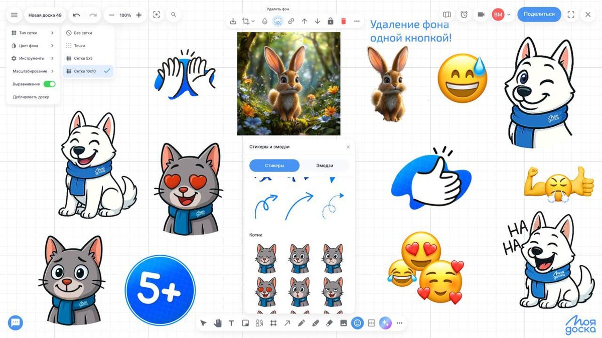 Как видите я не просто так провожу опросы и собираю анкету с предложениями - https://t.me/moyadoska/173 в прошлый раз больше всего голосов набрали пункты с удалением фона с картинок и эмодзи, стикерами - все это и не только уже выпущено! ➖Удаление фона с картинок - выделите нужную картинку и в панели настроек над ней нажмите "Удалить фон", подождите несколько секунд - и все готово! Вот так просто! ➖Добавлен раздел со стикерами и эмодзи - выберите тот что наравится, нажмите на него и потом нажмите на доске где его необходимо добавить. ➖Новые типы сеток - в точку, 5 на 5 и 10 на 10, при мастабировании клетки больше не съезжают что позволяет точно ориентироваться по ним. ➖Ряд полезных мелочей: новые иконки карандаша и маркера чтобы их нельзя было спутать, для цвета фона доски можно вставить в поле ввода свой HEX-цвет, исправлен баг при слетании разлиновки фрейма P.S. Если функционал еще не виден у Вас - очистите кэш браузера и обновите страницу. P.P.S. Просьба заполнить анкету вот