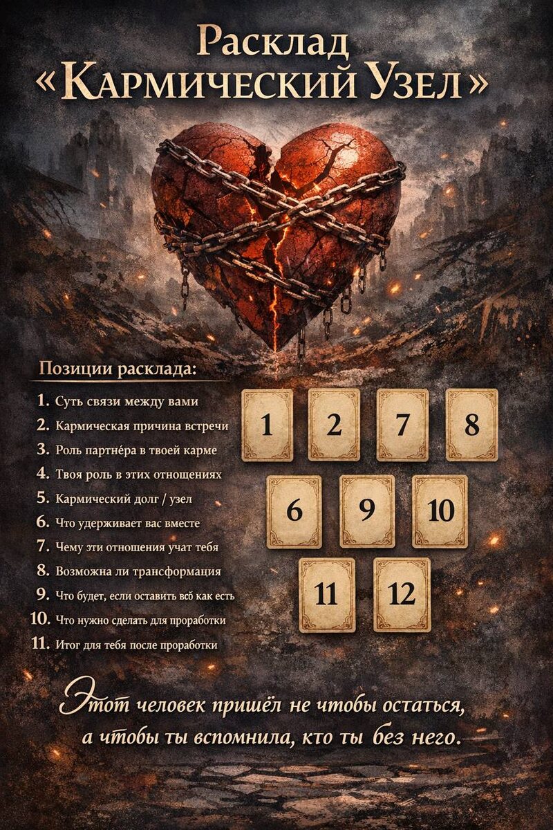 » Для понимания: зачем этот человек в моей жизни и можно ли закрыть карму Подходит, если: — тянет, но больно — не отпускает — отношения нестабильные — ощущение долга, вины, зависимости — мысли: «Почему я снова здесь?..» 💔 Позиции расклада 1️⃣. Суть связи между вами Что это за отношения на самом деле? Карма, судьба, иллюзия, привязка, урок, зависимость. 2️⃣. Кармическая причина встречи Зачем души встретились? Незавершённые узлы прошлых жизней, родовая история, клятвы, жертвы, власть, предательство. 3️⃣. Роль партнёра в твоей карме Кто он для тебя по судьбе: учитель, разрушитель иллюзий, зеркало, провокатор, кармический кредитор. 4️⃣. Твоя роль в этих отношениях Жертва? Спасатель? Контролёр? Где ты застряла и что повторяешь. 5️⃣. Кармический долг / узел Что именно нужно отработать: страх одиночества, зависимость, обесценивание себя, гордыня, отказ от себя ради любви. 6️⃣. Что удерживает вас вместе сейчас Любовь, страх, привычка, энергетическая привязка, чувство вины, сексуальна