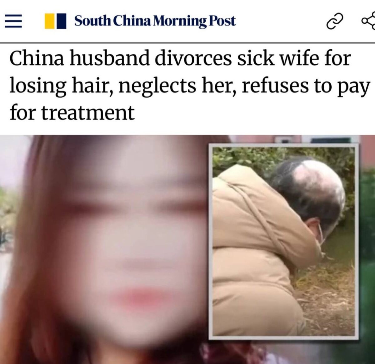 💇♂️ Рубрика: Общество Китаец решил, что брак без волос — это не его история. Он подал на развод после того, как его жена начала терять волосы из-за болезни. В суде мужчина заявил, что волосы — это важная часть женской привлекательности, и он не готов мириться с их отсутствием. 💇♀️ «Я женился на женщине с волосами, а не на лысой», — заявил он. Судя по всему, для него это не просто эстетический вопрос, а принципиальный момент в отношениях. История вызвала бурное обсуждение в сети. Одни считают, что мужчина имеет право на свои предпочтения, другие называют его поведение эгоистичным и бесчувственным. 🤔 А как вы думаете, это справедливо?Читать на сайте ➡️ Подписаться