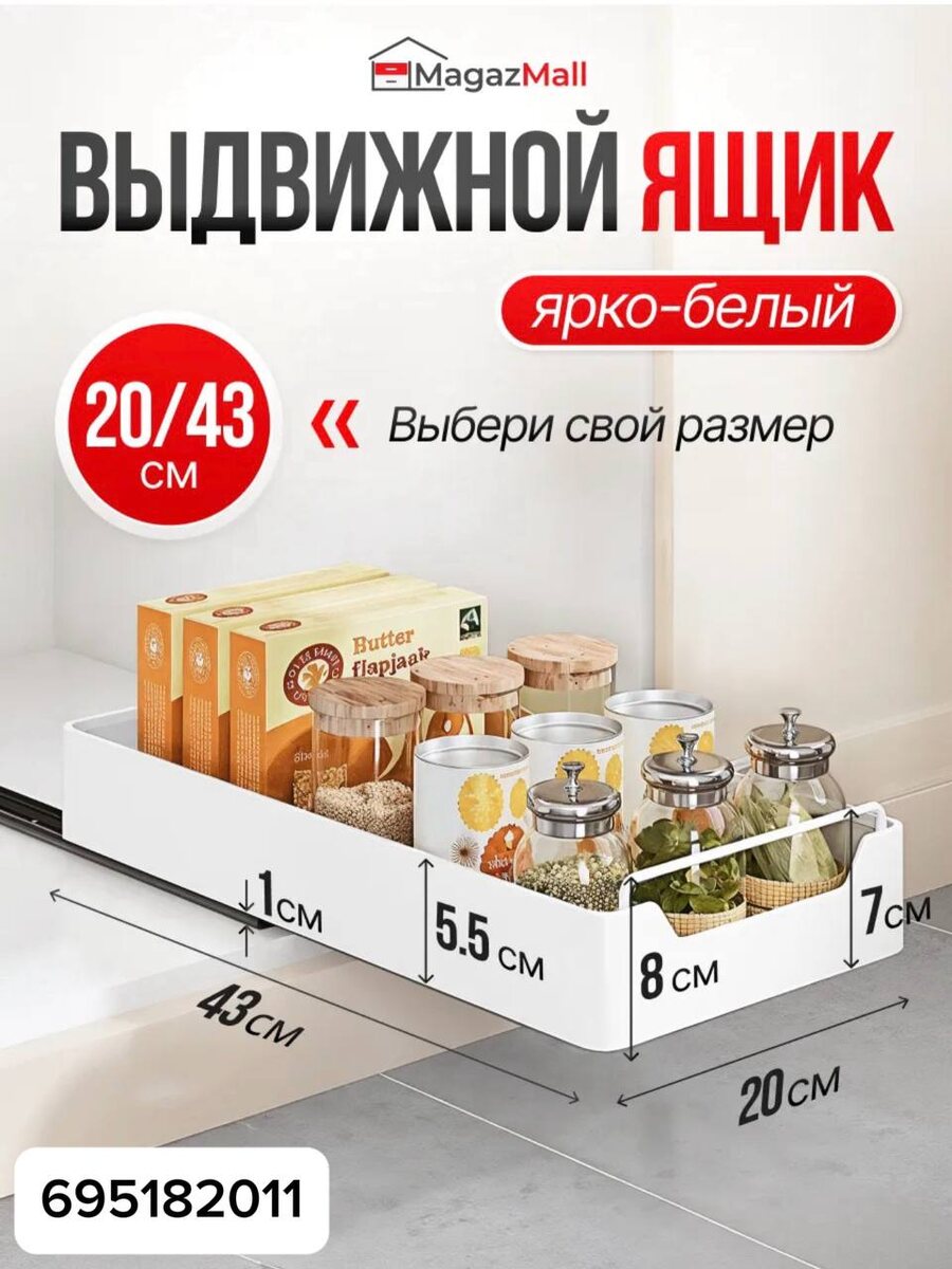 Ящик крепится под полкой или шкафом, не занимая полезного пространства. Его глубина и длина позволяют разместить специи, упаковки с крупами, чай, капсулы для кофе, косметику, бытовые мелочи или средства для уборки. Гладкая поверхность легко моется, а выдвижной механизм работает плавно и тихо.