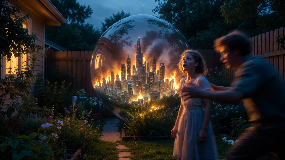 Я стояла, заворожённая. Это было красиво. Странно и пугающе красиво. И внутри этого мерцания, в его глубине, начали проступать образы. Сначала это были просто цветовые пятна, потом очертания зданий. Высокие, стреловидные башни из стекла и металла, которых не было в нашем городе. И они… горели. Оранжевые языки пламени лизали фасады, чёрный, маслянистый дым клубился, поднимаясь к небу, окрашенному в багровые тона. Город будущего. Или кошмар.