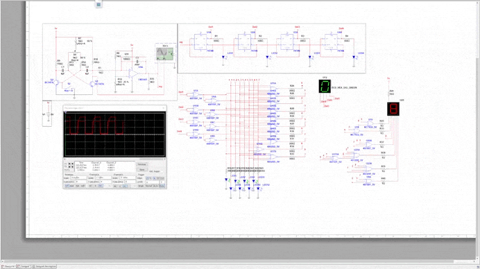 Сегодня рассмотрим построение простого усройсва, которое предназначенно для подсчета испульсов на базе D-триггеров, которое основанно на делителе частоты. Цель статьи продемонстрировать принцип деления частоты, каскадного счёта импульсов и формирования двоичного кода для дальнейшего отображения на индикаторе. Устройство состоит из: Вывод информации осуществляется на 9-ричный дисплей и 16-ричный дисплеи. Соответсвенно возможность вывода от 0 до 9 и от 0 до F. Полная схема предсавленна ниже. Генератор импульсов