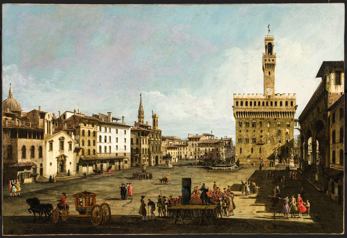 Для венецианской живописи XVIII века характерно разнообразие требований заказчиков и, как следствие, разнообразие художественных жанров. Алтарные картины, дворцовые украшения, портреты, пейзажи в стиле рококо и сатирические жанровые картины создавались для различных целей и часто исходили из разных идей. Городской пейзаж — типичная для XVIII века и типичная, если не исключительно, для венецианского искусства; его наиболее выдающимися представителями были Джованни Антонио Каналь, известный под прозванием Канале́тто (1697–1768) и его племянник Бернардо Беллотто (1721–1780). Три картины последнего можно найти в Будапештском Музее изобразительных искусств. Две флорентийские "ведуты", составляющие пару, — это ранние работы. Привлекательность вида площади Синьории, написанного около 1745-1750 годов, заключается не только в умелом использовании перспективы и топографической точности, но и в передаче залитой солнцем атмосферы и выразительного стиля "стаффаж". P.S. Приглашаем вас посетить