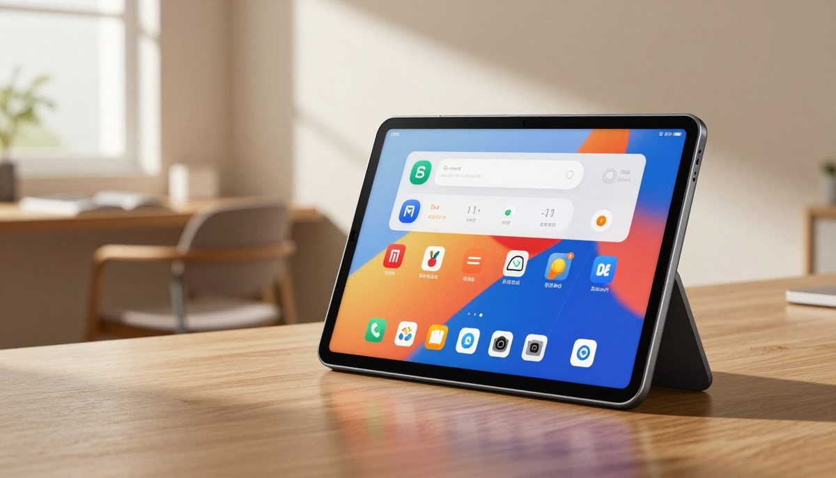 Реалистичное и детальное изображение планшета Xiaomi Redmi Pad SE M84 в графитово-сером цвете, расположенного на переднем плане, демонстрирует его элегантный дизайн и функциональность. Экран планшета должен отображать яркий, красочный интерфейс, подчеркивающий его возможности. На среднем плане элегантное рабочее место с современным столом и технологическими гаджетами ненавязчиво дополняет контекст, а мягкий фон представляет собой эстетичное сочетание офисных элементов, таких как книжные полки и растения. Освещение должно быть мягким и теплым, имитируя естественный солнечный свет, проникающий через окно, создавая профессиональную и располагающую атмосферу. Ракурс съемки планшета немного приподнят, подчеркивая его тонкий профиль и премиальную отделку.