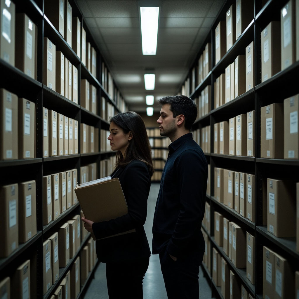 Апофеозом стал вечер в архивной комнате. Она зашла за старой папкой договоров — хотела проверить одну деталь, полагаясь на тишину и уединение. Полки с пыльными коробками создавали узкие коридоры. Воздух пах бумажной пылью и временем.