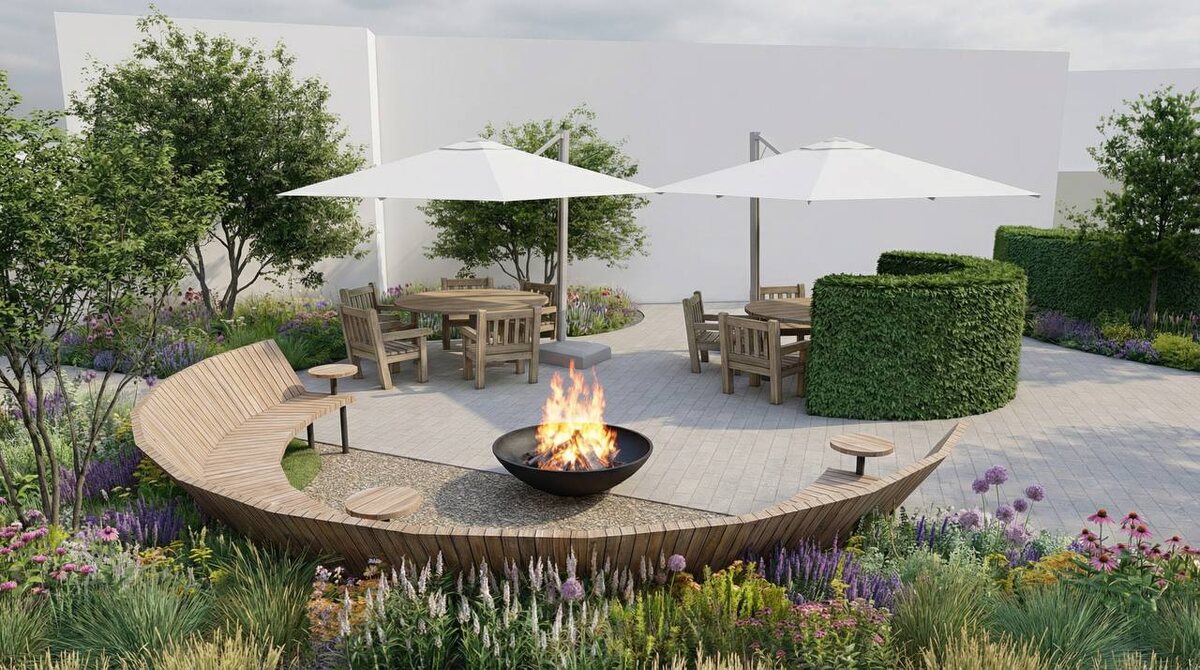 : 1.Построение геометрии в Sketch up 2.Отрисовка деталей в Procreate 3.Загружаем в нейросеть и пишем промт Оставляю промт ⤵️ 🍀Сделай это изображение летнего кафе в саду реалистичным. Живые изгороди из стриженых туй, природные цветники в стиле пита удольфа. Сохрани формы деревьев, но сделай их реалистичными. Садовая мебель из дерева тика. Полукруглая скамья из лиственницы. В очаге горит огонь. Оставь очертания здания на фоне как на эскизе, просто оставь его белым. Сохрани ракурс и направление теней . Облачный летний день вторая половина дня🍀 ❗️Растения полностью сделал как я рисовала, только одну деталь добавил, и это ошибка, на которую заказчики не обратят внимание. Найдёте ?) На самом деле этапов работы только прибавилось . Можно было остановиться на скетче и доработать его на планшете, но как теперь удержаться ?)). Так что так или иначе все равно работаешь как обычно , но с ещё одним инструментом, который , скажем , упрощает рендер и не привязывает к мощному компу . Это в