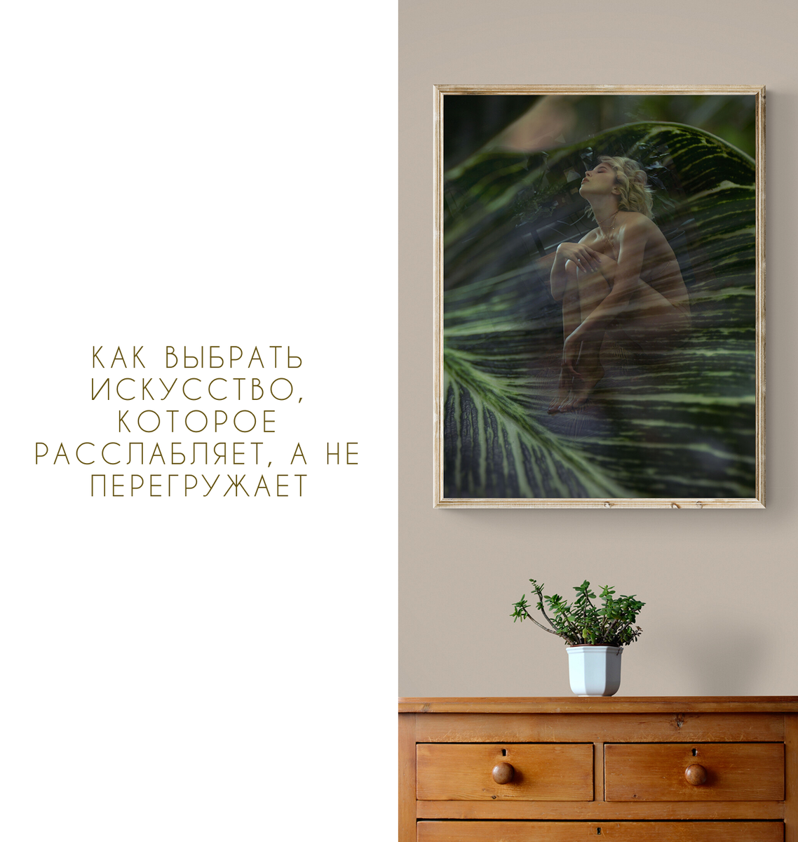 Искусство в интерьере часто выбирают "глазами". Под цвет дивана. Под формат стены. Под тренд. Но тело реагирует на искусство иначе. Оно не оценивает композицию, оно чувствует, можно ли рядом расслабиться. Есть работы, которые выглядят эффектно, но рядом с ними хочется собраться. Они требуют внимания, объяснений, интеллектуального усилия. Это не плохо. Но если такое искусство оказывается в пространстве отдыха, тело не получает паузы. Оно остаётся в режиме наблюдения и контроля. Расслабляющее искусство не захватывает. Оно приглашает к диалогу. Первый ориентир - дыхание. Самый простой тест: встаньте перед работой и сделайте медленный вдох. Если дыхание углубляется - работа вам подходит. Если становится поверхностным или хочется отвести взгляд - телу тяжело. Тело всегда реагирует честно, даже если разум говорит: "Это модно" или "Так должно быть". Слишком контрастные цвета, агрессивные линии, чрезмерная плотность деталей создают напряжение. Глаз не находит точки отдыха и передаёт это телу.
