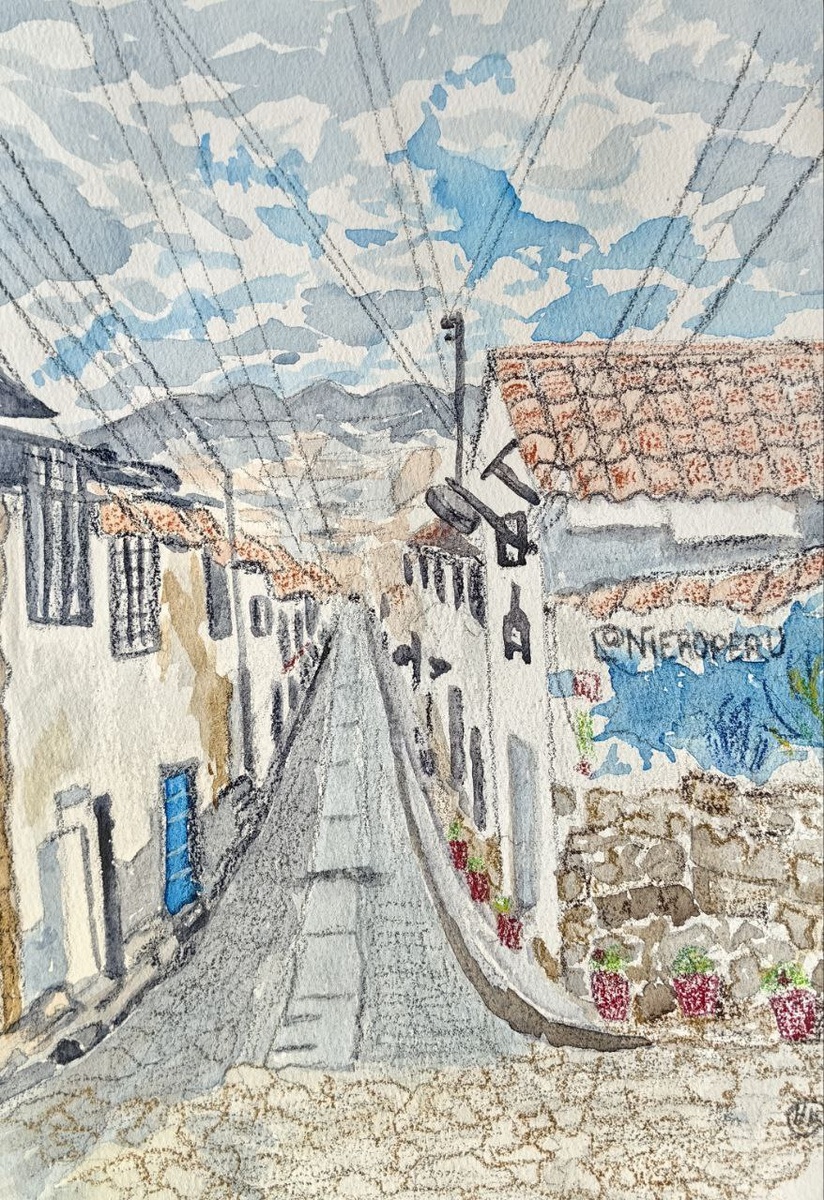 Нарисовала акварелью с детализацией цветными карандашами пейзаж района художников в городе Куско, в Перу.